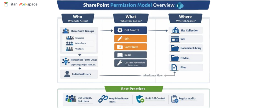 Answer: SharePoint permissions work through a layered security model that combines users, groups, permission levels, and inheritance. Access is typically granted to SharePoint groups (not individuals), which are assigned permission levels like Read, Contribute, or Edit. These permissions apply at different scopes such as sites, libraries, folders, or files, with inheritance flowing downward unless explicitly broken. This model supports scalable SharePoint user access management and aligns well with enterprise security needs.
